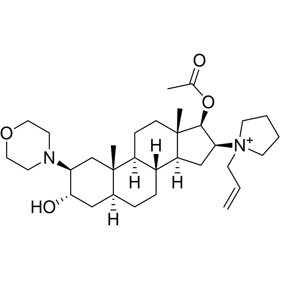 Le rocuronium est un curare non dépolarisant qui induit une relaxation musculaire en empêchant l'acétylcholine de se fixer aux récepteurs nicotiniques au niveau de la jonction neuromusculaire. Ses effets apparaissent dans les 1 à 2 minutes suivant l'administration intraveineuse et durent généralement de 30 à 60 minutes, selon la dose administrée. Le rocuronium se caractérise par un délai d'action rapide et une durée d'action intermédiaire, ce qui le rend particulièrement adapté à l'intubation et aux interventions chirurgicales. Son action peut être antagonisée par des inhibiteurs de l'acétylcholinestérase, qui augmentent la concentration d'acétylcholine au niveau de la jonction.