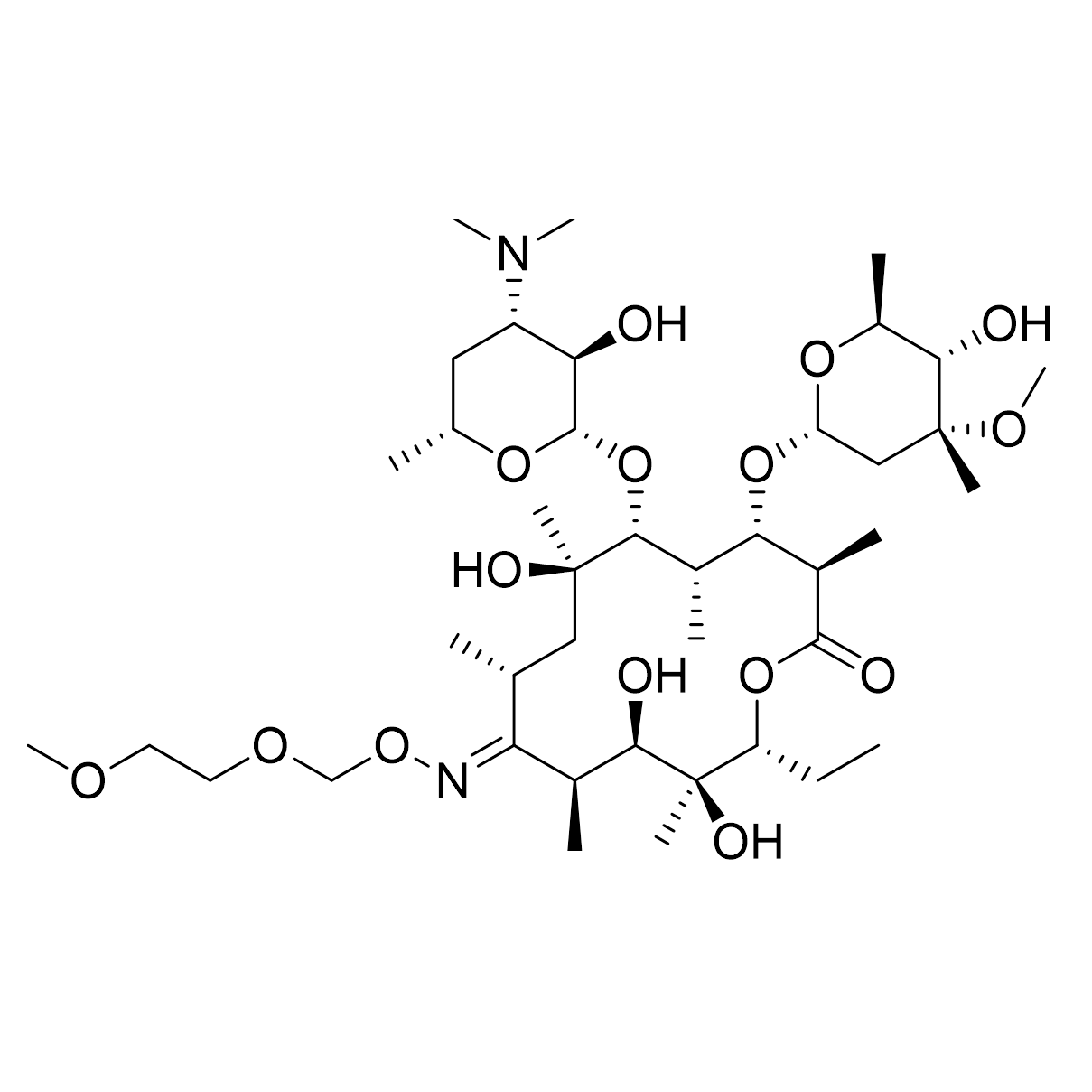 La roxithromycine est un antibiotique macrolide semi-synthétique dérivé de l'érythromycine, développé dans les années 1980 par le laboratoire pharmaceutique allemand Hoechst Uclaf. Son développement a débuté en 1980 et son utilisation médicale a été approuvée en 1987, année où un brevet a été accordé. Conçue pour améliorer l'érythromycine, la roxithromycine présente une stabilité accrue et un spectre d'activité plus large contre diverses infections bactériennes, notamment les infections des voies respiratoires, de la peau et des voies urinaires. Elle est largement commercialisée sous différentes marques dans plusieurs pays, bien qu'elle ne soit pas autorisée aux États-Unis. La roxithromycine agit en inhibant la synthèse des protéines bactériennes, ce qui la rend efficace contre les bactéries Gram-positives et certaines bactéries Gram-négatives. Elle est généralement bien tolérée et présente une incidence d'effets indésirables gastro-intestinaux plus faible que l'érythromycine.