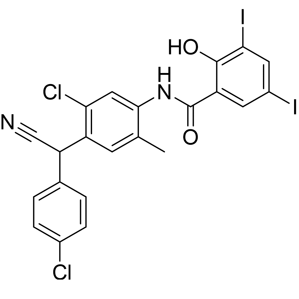 Closantel is a halogenated salicylanilide anthelmintic first discovered and developed in the 1970s by Janssen Pharmaceutica. It emerged as one of several highly effective anthelmintic agents introduced during a period of major advancements in veterinary parasitology. Closantel is a synthetic, halogenated salicylanilide anthelmintic primarily used in veterinary medicine for the treatment and control of various parasitic infections in cattle and sheep. It is effective against liver flukes, blood-sucking nematodes, and some arthropod larval stages.