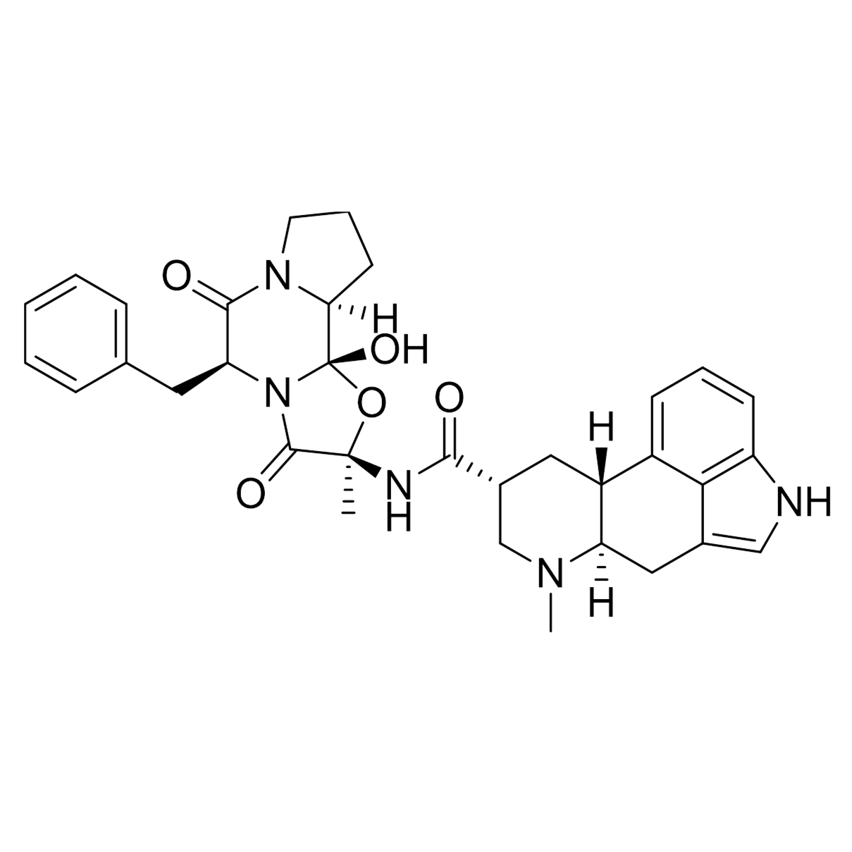 Dihydroergotamine (DHE) is a semisynthetic ergot alkaloid derived from ergotamine that is mainly used to abort acute migraine and cluster headache attacks by activating serotonin, dopamine, and noradrenaline receptors to constrict blood vessels in the brain and interrupt pain pathways. Because it is poorly absorbed when taken orally, DHE is given by injection or as a nasal spray, providing an effective option for severe headaches or when triptans are ineffective, but it must be used cautiously due to cardiovascular risks and contraindications in pregnancy or patients with vascular disease.