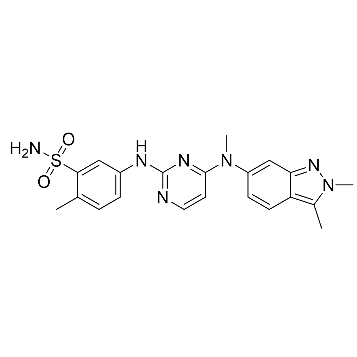 Pazopanib is an oral tyrosine kinase inhibitor (TKI) primarily used to treat certain types of cancers. It works by blocking multiple receptors, including VEGFR, PDGFR, and c-Kit, which play key roles in tumor growth and blood vessel formation. By inhibiting these receptors, pazopanib prevents new blood vessel development, slowing tumor progression. It is mainly prescribed for advanced renal cell carcinoma (RCC) and advanced soft tissue sarcomas (STS). The drug is administered once daily in tablet form and is metabolized in the liver via CYP3A4 enzymes. Common adverse effects include hypertension, diarrhea, hair color changes, and fatigue. Pazopanib is often chosen for patients who cannot undergo chemotherapy or require targeted therapy. Regular monitoring of liver function and blood pressure is essential while on treatment. Overall, pazopanib provides a targeted therapy option that helps improve progression-free survival in cancer patients.